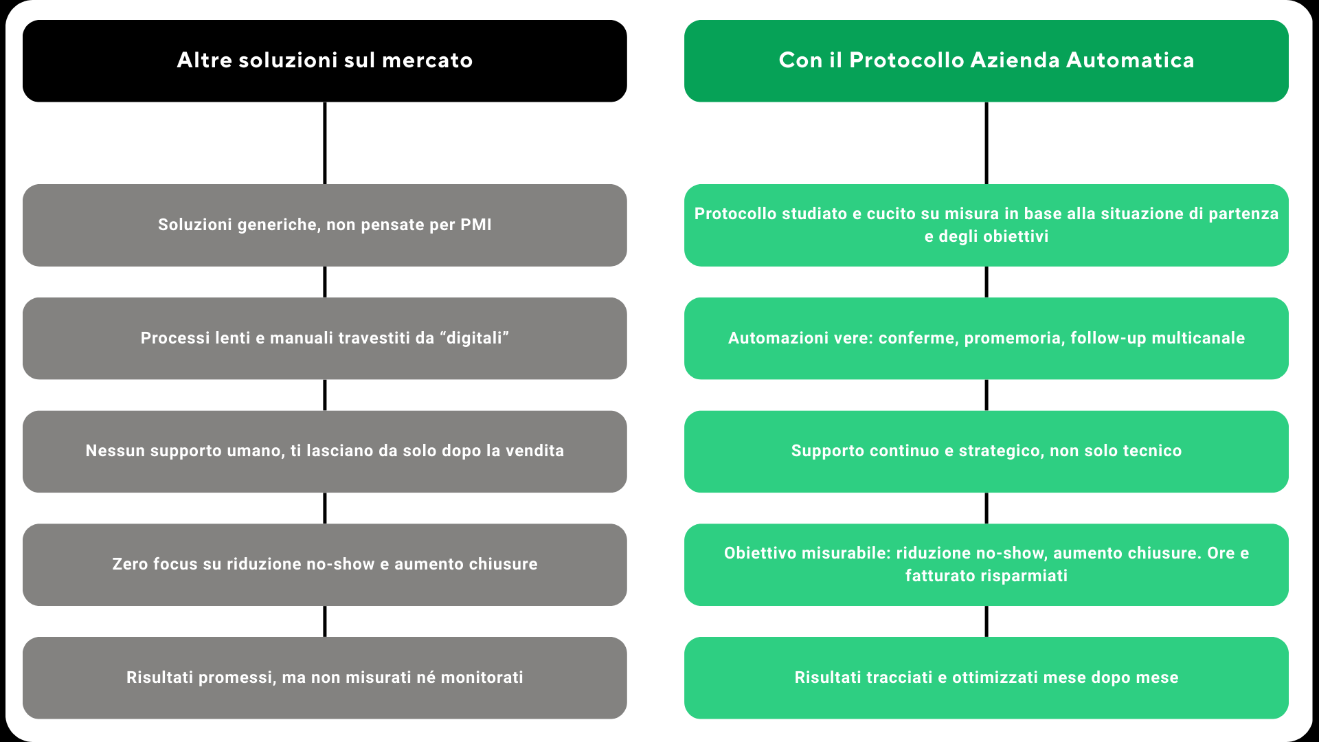 Azienda Automatica è stato creato per PMI italiane di diversi settori: studi professionali, cliniche, servizi B2B, retail, estetica, consulenza. Se hai clienti e appuntamenti da gestire, funziona.